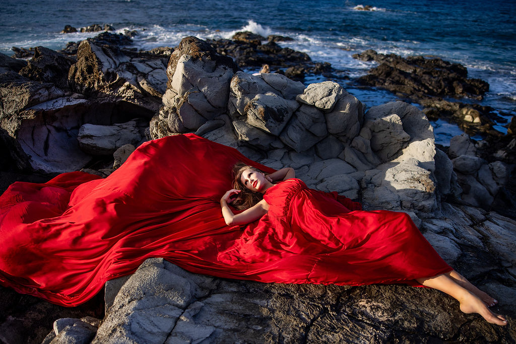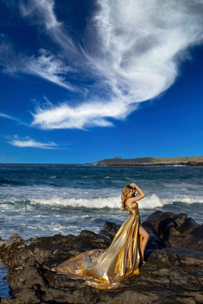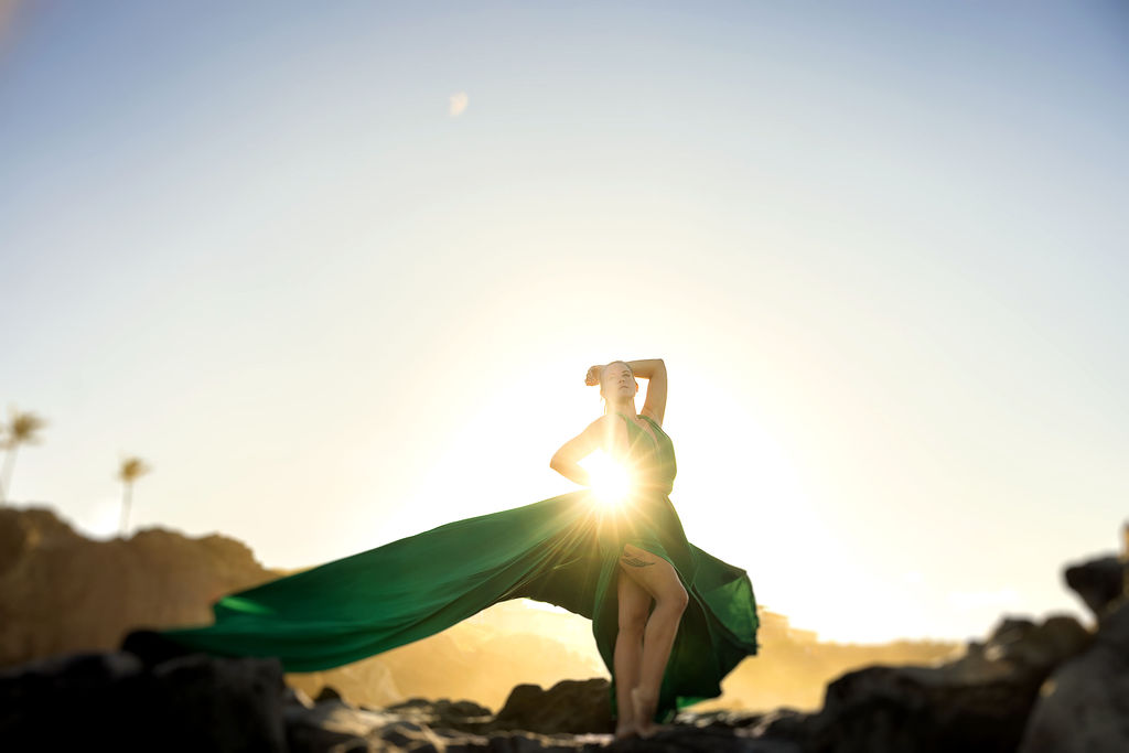 Maui provides some of the world’s most breathtaking backdrops for flying dress sessions. Locations like Ironwoods Beach, DT Fleming Beach, and nearby cliffside lava rocks offer wide-open sky, glowing sunsets, and beautiful ocean views.