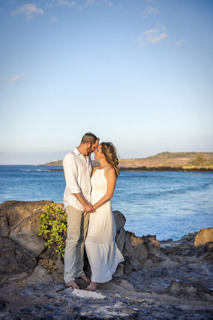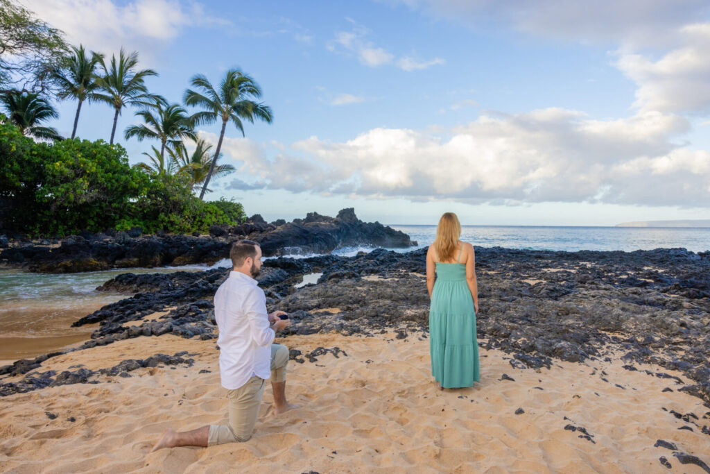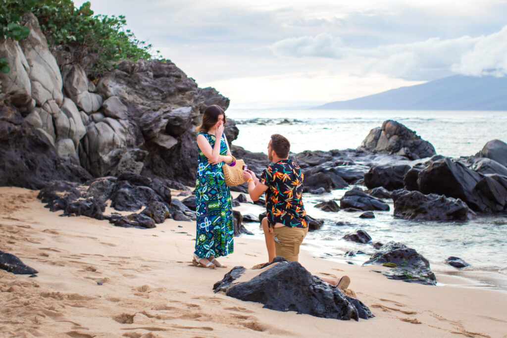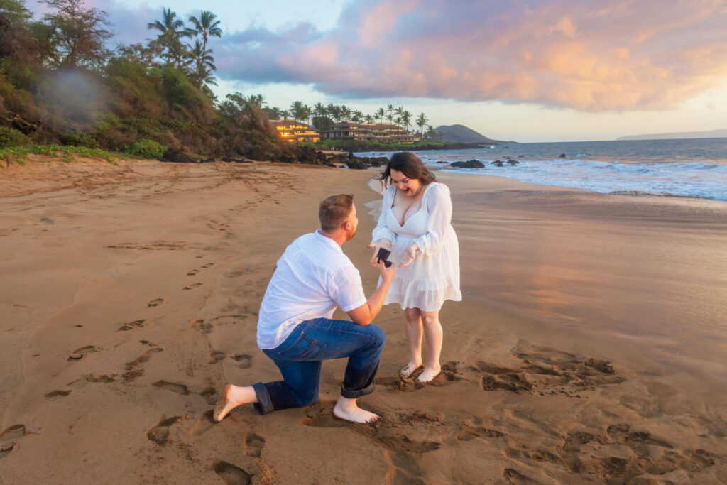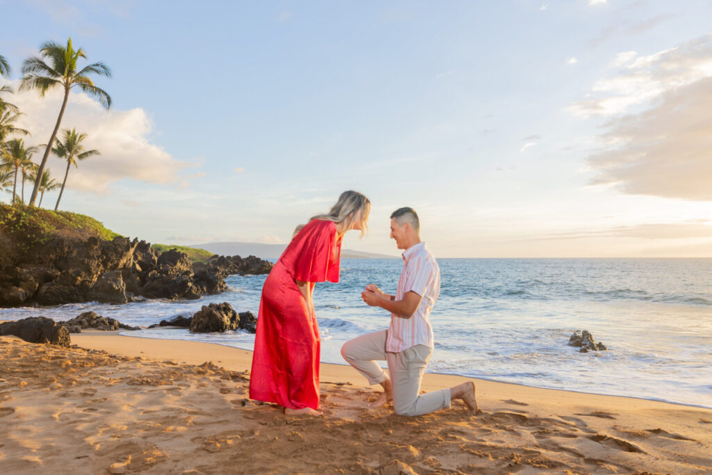 This is where experience really helps. We can start from a distance, look like we’re photographing scenery, or begin as a casual Maui couples session and let the proposal happen naturally. We’ll choose the approach that fits your partner best.
